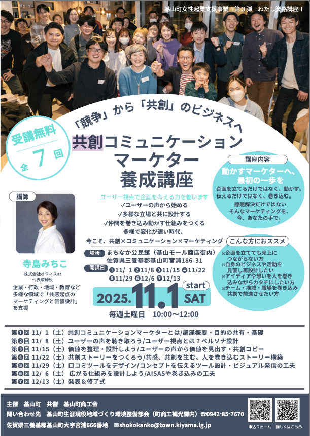 オフィスatの寺島は、佐賀県三養基郡基山町が女性支援起業プログラムの一環として主催した共創コミュニケーションマーケター養成講座の講師を務めました。本講座は、女性が持つ能力や可能性を抽出し社会で活かすことができるよう、起業へ向けて一歩を踏み出すきっかけ作りと起業家育成に繋げるプログラムです。
